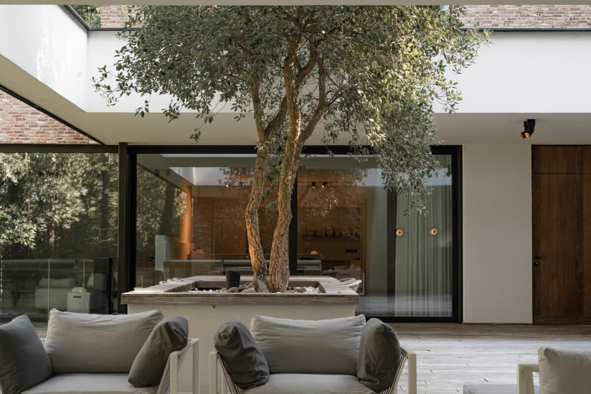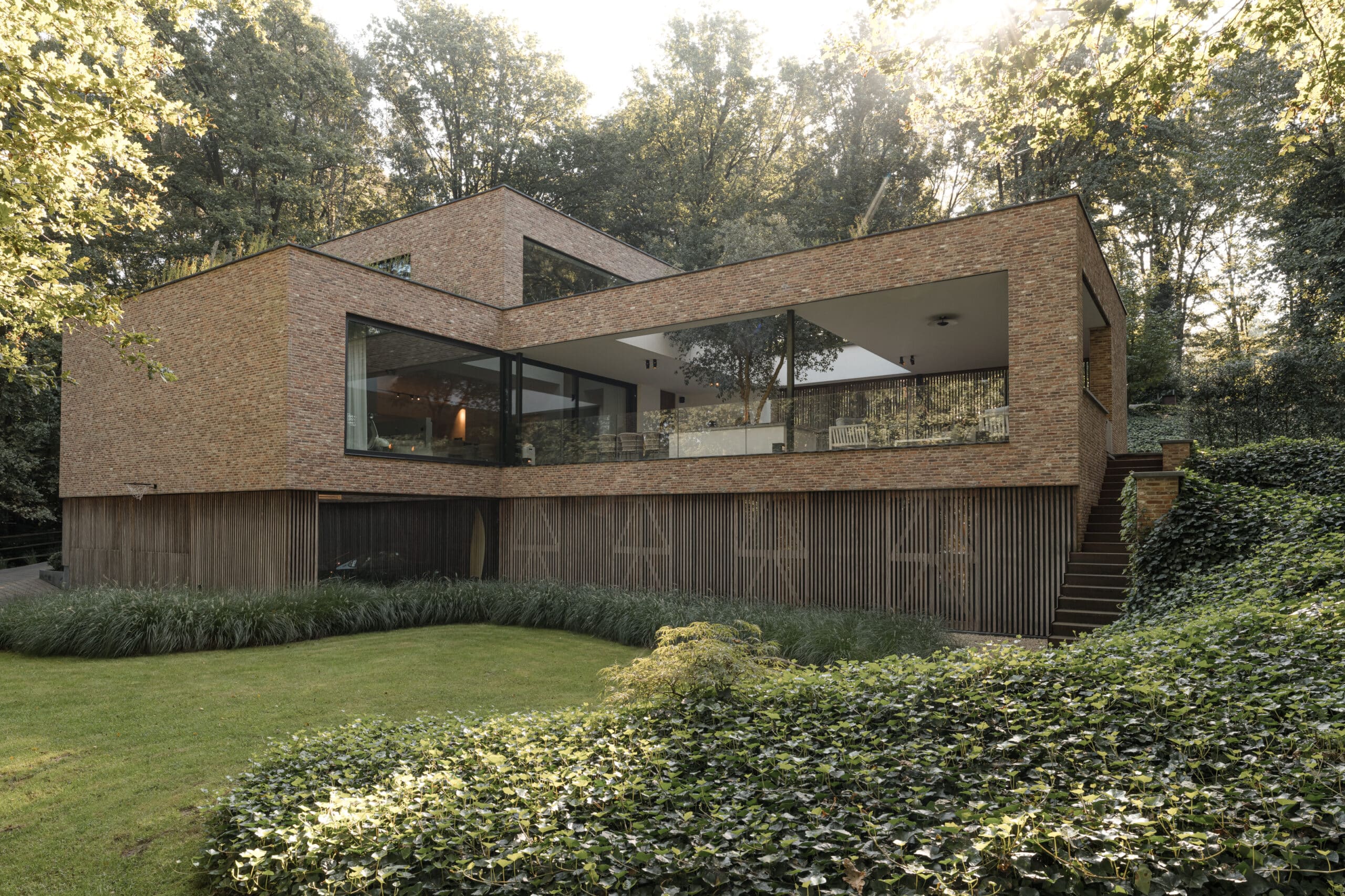 Diezelfde warmte wordt gegarandeerd door de gebruikte materialen. Met buiten onder meer een recuperatiesteen in zachte kleurtinten en een geraffineerde houten gevelbekleding met een subtiele functionele knipoog naar het verleden. Het interieur vertelt datzelfde warme verhaal, met als protagonisten de zandkleurige kalkverf en massief eiken- en notenhout. Deze aardse elementen leven volledig in harmonie met de groene weelde rondom de woning en creëren hierdoor een eindeloos rustgevoel en een tijdloze woonbeleving.