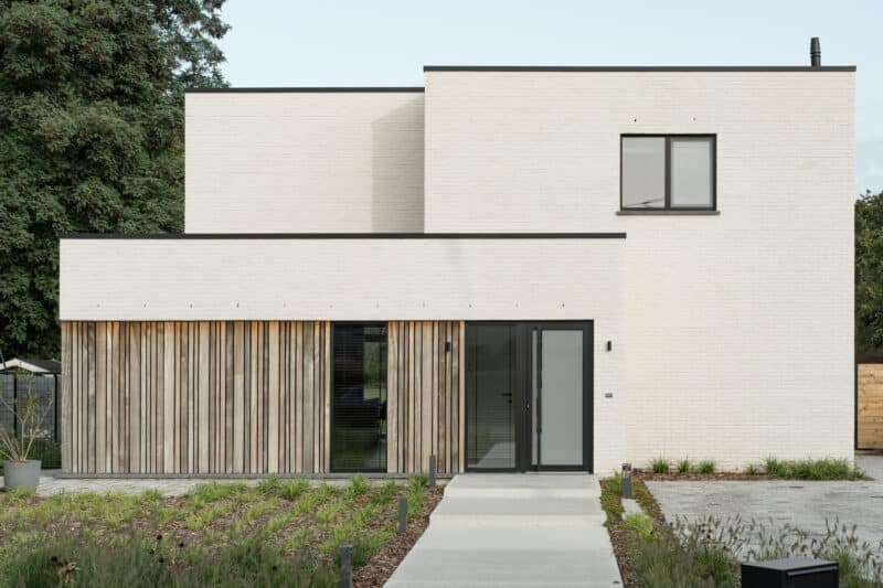 Diezelfde warmte wordt gegarandeerd door de gebruikte materialen. Met buiten onder meer een recuperatiesteen in zachte kleurtinten en een geraffineerde houten gevelbekleding met een subtiele functionele knipoog naar het verleden. Het interieur vertelt datzelfde warme verhaal, met als protagonisten de zandkleurige kalkverf en massief eiken- en notenhout. Deze aardse elementen leven volledig in harmonie met de groene weelde rondom de woning en creëren hierdoor een eindeloos rustgevoel en een tijdloze woonbeleving.